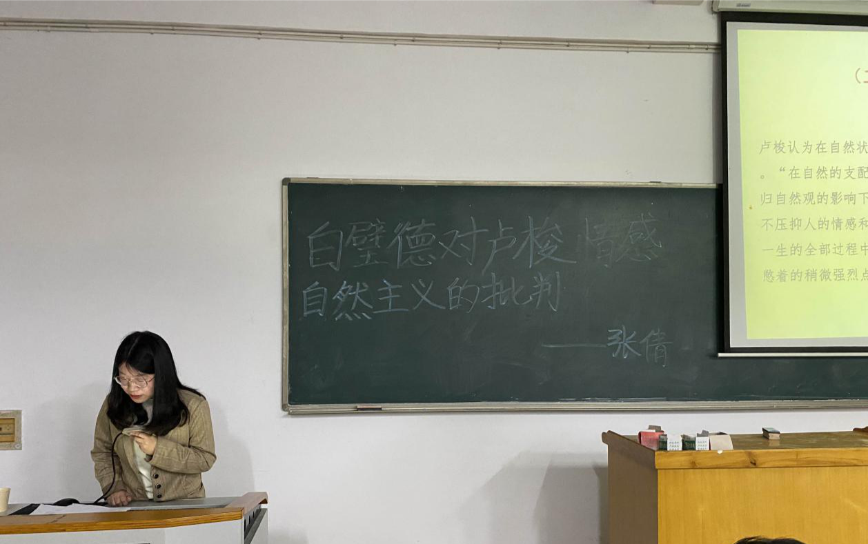 张倩首先为同学们介绍白璧德的生平,使同学们对白璧德有了初步了解。随后紧扣主题,进一步从“自然人的概念”和“自然而然的状态”两个层面阐述白璧德是如何批判卢梭自然主义。最后张倩就白璧德对卢梭情感主义的批判阐发个人理解,其中涉及“情感本身的属性”和“个人与集体的关系”两个深层次问题,点明了璧德的批判具有现实阶段性。