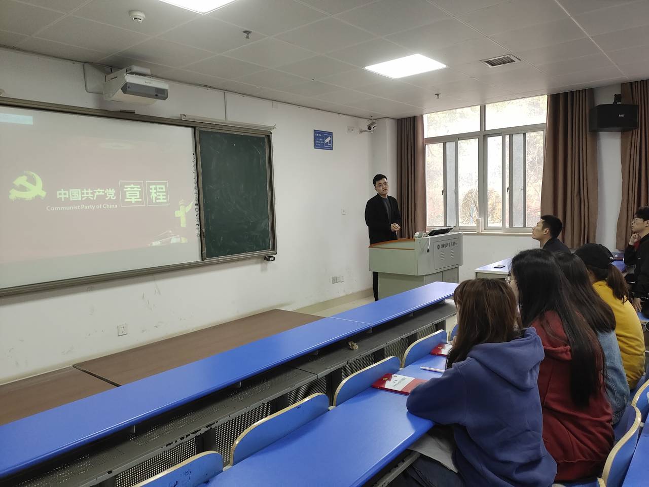 3月26日上午,中文学院学生第二党支部在集中收看《就认这个理——百年一课〈恰同学少年〉》后,由党支部书记刘子行老师为支部全体党员、发展对象、入党积极分子围绕《党章》和《中国共产党基层组织选举工作条例》进行专题党课讲授,迎接学校第四次党代会召开。