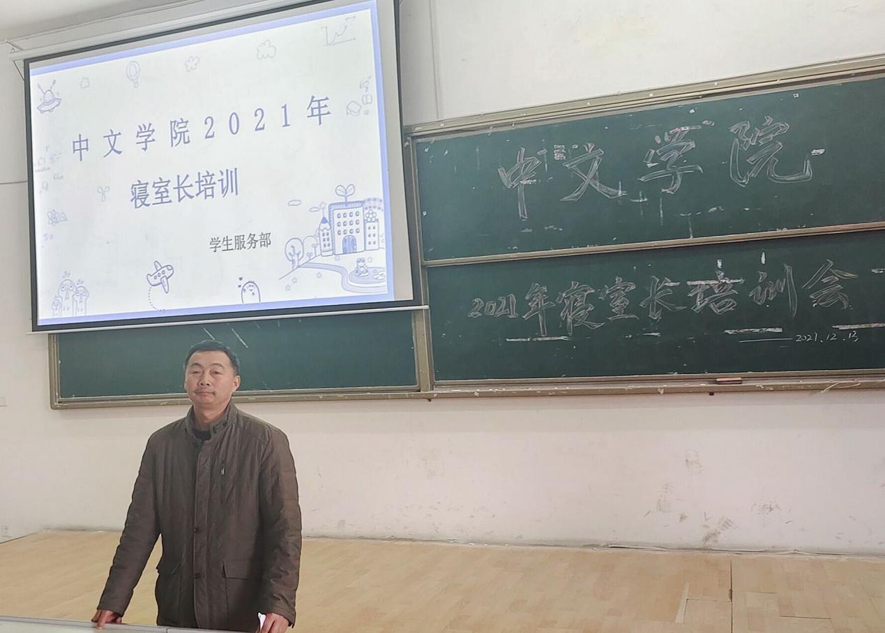 12月13日中午,中文学院2021年下学期寝室长专题培训会在9T2举行,全体寝室长参加培训。学院党委副书记贺波彬主讲,学工办刘子行、徐去非老师参会。