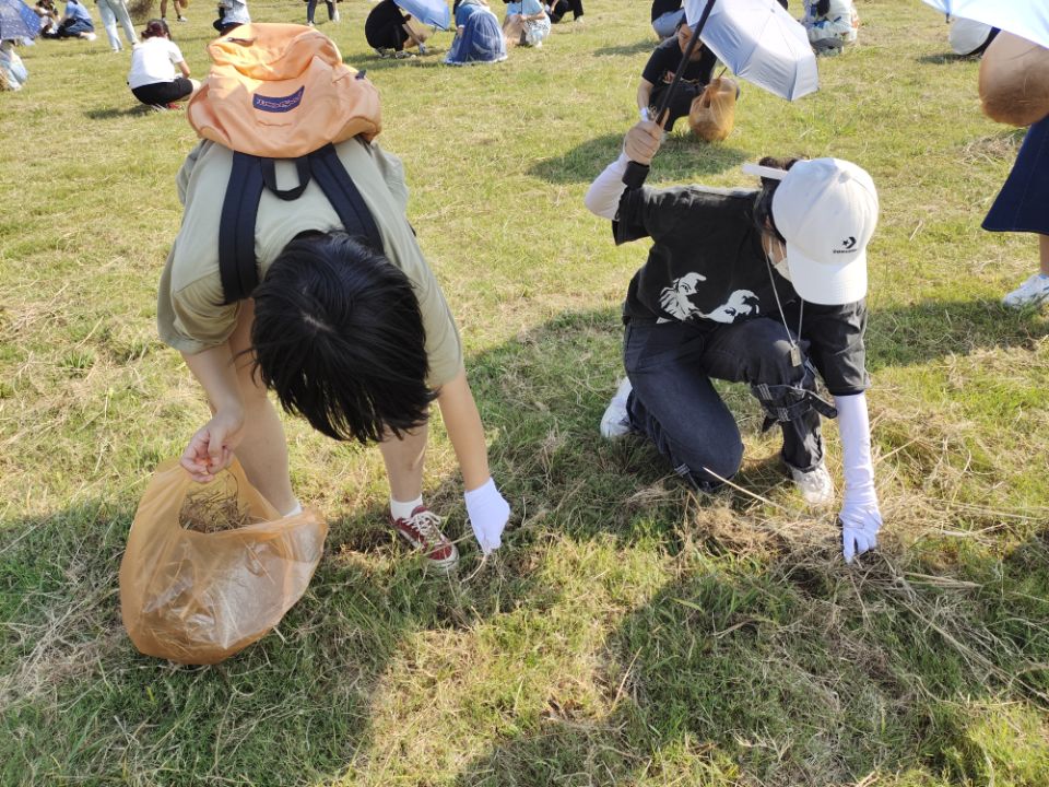 烈日下,同学们弯着腰,仔细地清除草坪里的杂草和垃圾,草坪上到处是他们来来往往忙碌的脚步。