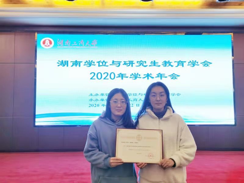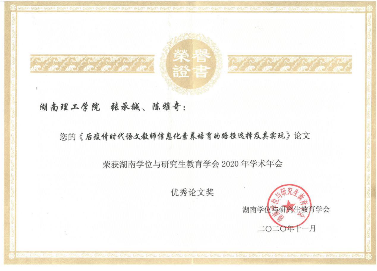 2020年11月21至22日,湖南学位与研究生教育学会2020年学术年会在长沙召开。我院学科教学语文专业硕士研究生张承铖、陈雅奇两位同学受邀参加本次学术年会颁奖礼,完成《后疫情时代语文教师信息化素养培育的路径选择和实现》成果获“优秀论文奖”。