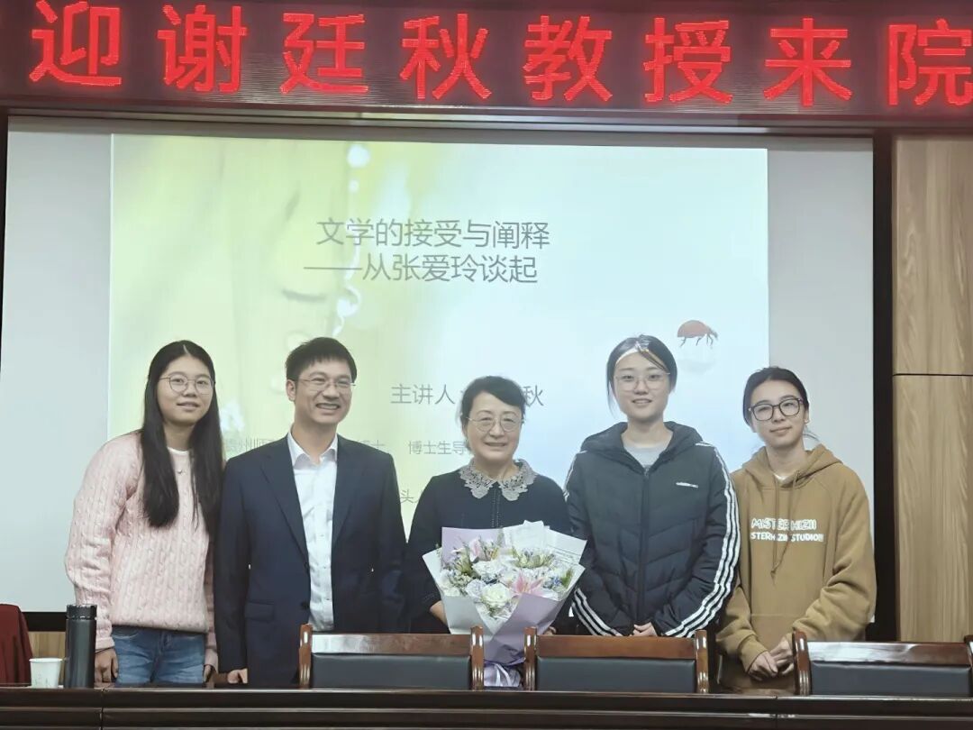 10月30日晚,贵州师范大学博士生导师谢廷秋教授应邀在9401会议室作题为《文学接受与阐释——从张爱玲谈起》的学术讲座。文新学院副院长张勇,中国现当代文学教研室蒋士美主任,阮娟、李云飞、陈天、刘雨等老师出席。讲座由学院院长助理周爱勇主持。