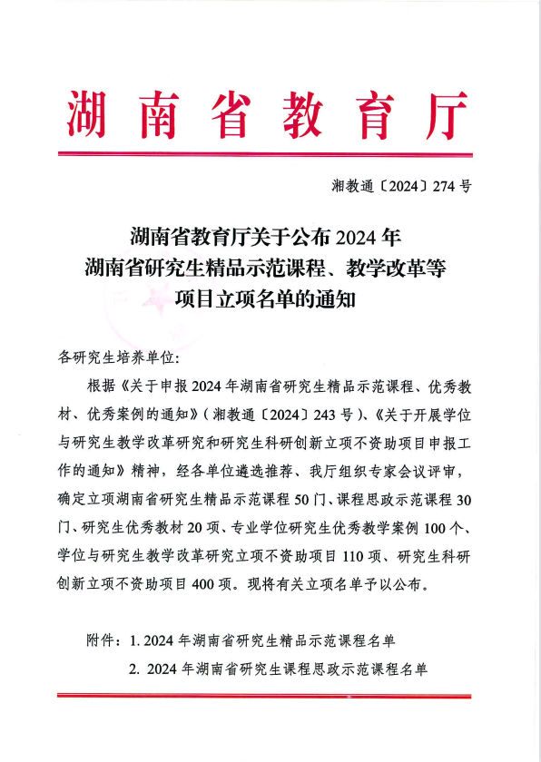 2024年12月31日,湖南省教育厅公告(湘教通〔2024〕274 号),公布了湖南省研究生精品示范课程的立项名单,我院封传兵教授主讲的研究生专业课《音韵学》获批精品示范课程。