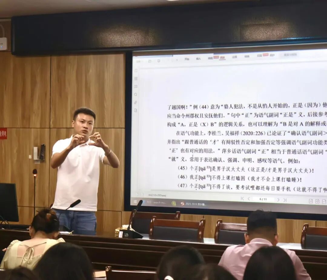 袁鑫以萍乡赣语中的核心语素“正”为研究对象,系统分析了其作为形容词、副词与助词的多功能用法。他指出,方言是语言的“活化石”,蕴含丰富的语法现象,值得深入挖掘,并鼓励同学们从母语出发,留心那些“日用而不知”的语言细节。