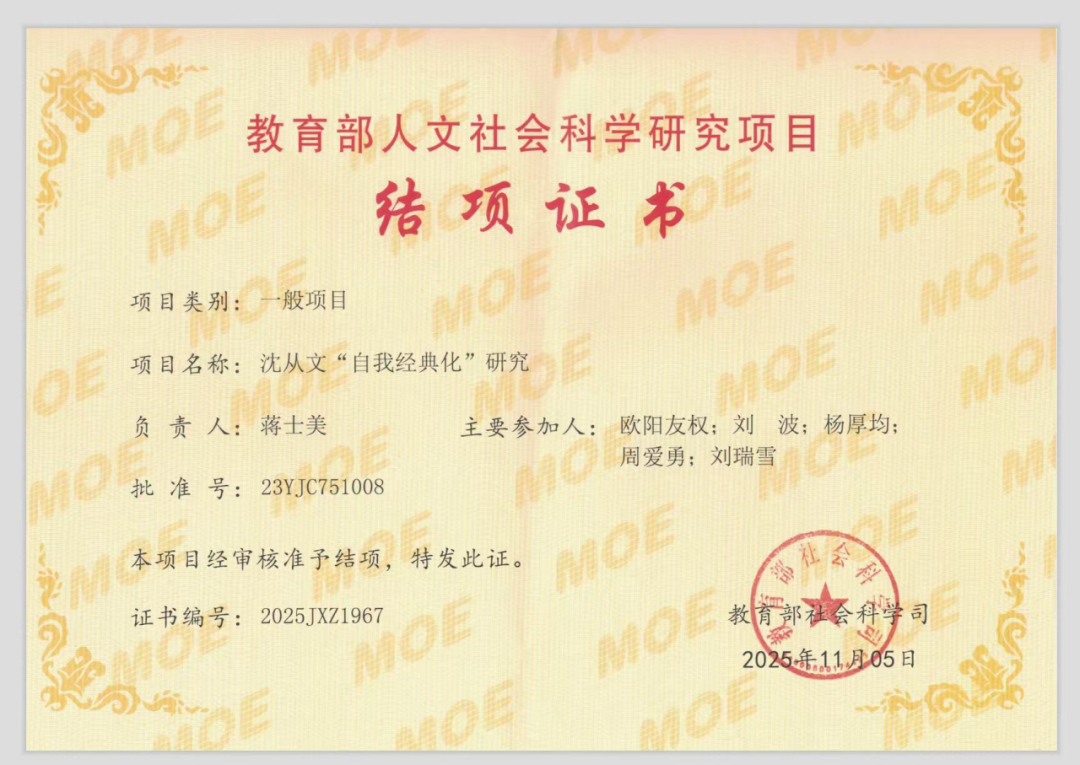 近日,由我院文学系蒋士美博士主持的教育部人文社会科学研究青年基金项目《沈从文“自我经典化”研究》(项目编号:23YJC751008)圆满完成研究任务,并以“著作+论文”的成果形式通过审核,提前顺利结项。