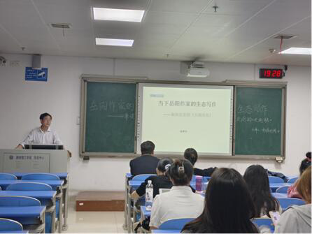 5月25日晚,教师第一党支部成员、学院党委书记杨厚均教授在12201上了一堂题为“当下岳阳作家的生态写作”的文学党课,教师第一党支部全体成员和部分本科生党员参加。杨厚均从生态写作的定义入手,说明生态写作是当下现代社会发展的产物,以岳阳作家的生态写作为例,阐释了岳阳的生态文学创作具有深厚的历史底蕴和独有的现实机缘,以及对今天的生态文学创作的启示。文学党课期间,全体与会党员观看了为纪念习近平总书记在岳阳提出“守护好一江碧水”殷切嘱托5周年而制作的“守护好一江碧水”专题纪录片,感受与思考岳阳生态建设取得的成果。观看结束后,党员同志分享了观后感。