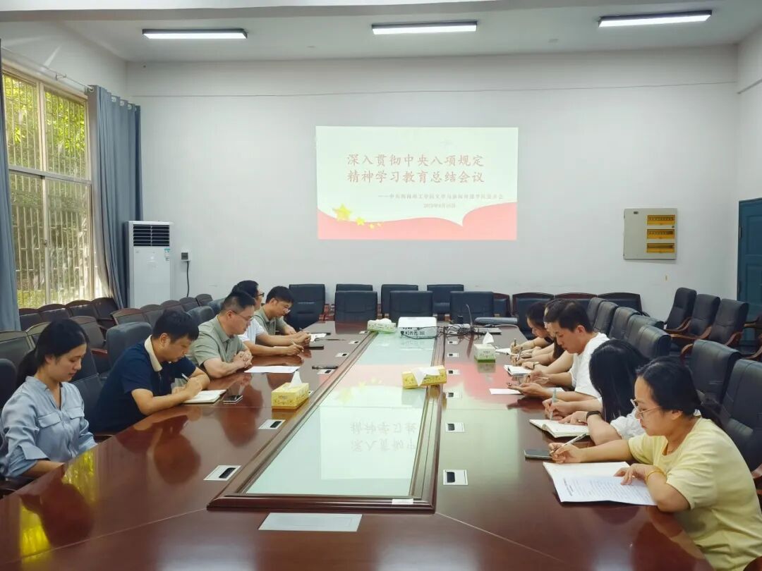 9月16日下午,文新学院党委在9106会议室召开中央八项规定精神学习教育总结会议。院党委牵头负责人王文锋作总结报告,副院长柳溪、肖涛、院长助理周爱勇及学院各党支部书记参加会议。