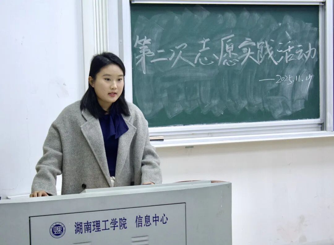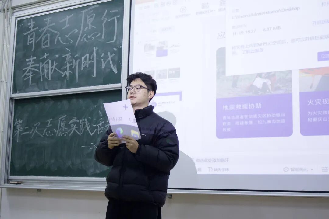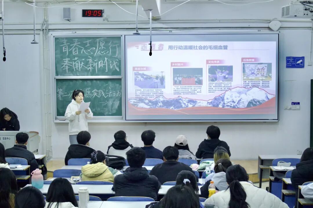 院青年志愿服务中心干事武鸿宇进行开场宣讲,她通过播放短视频、结合生活实例,围绕“志愿者的力量”“当代志愿者精神”和“为什么要强调青年志愿行”展开分享,生动展现了志愿者的价值与担当。她以学校河小青志愿服务队为例,指出该服务队自2017年至2025年累计参与2000多场志愿活动,200多位志愿者穿梭于校园与社会之间,用青春热度织就连接校园与外界的温暖纽带。