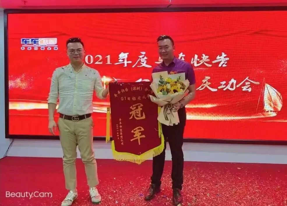 (在2021年度车车快告庆功会陈文国带领分公司获授锦旗)