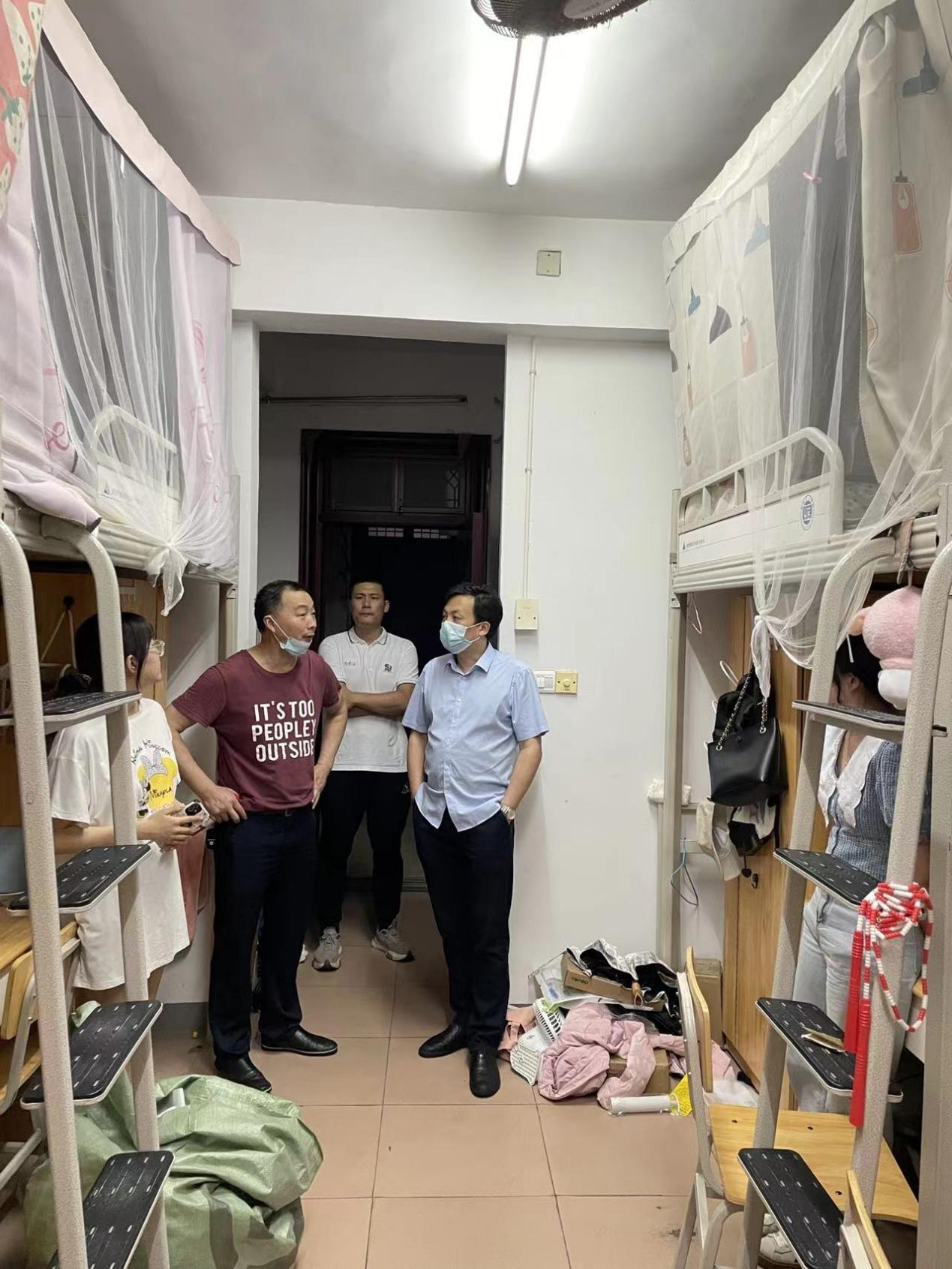 6月2日晚,学工部副部长毛伟,中文学院党委副书记贺波彬,中文学院刘子行和徐去非走访学生寝室,对宿舍院区和校园内有安全隐患处进行了走访巡查,并与毕业生话别。