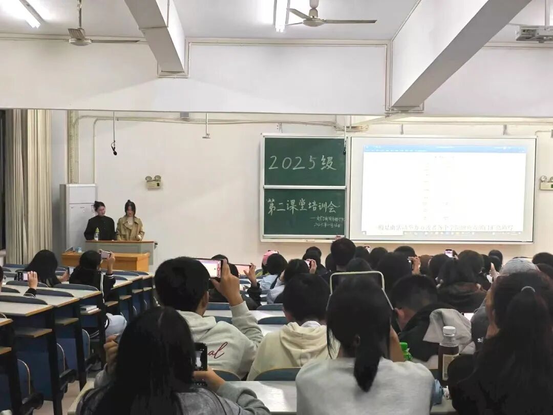 10月16日晚,文学与新闻传播学院于15208、15308教室召开2025级新生第二课堂培训会。会议由院学生会素拓部部长曾妍、副部长廖香倩、沈泽屹、向婉秋共同主讲,2025级全体新生参加。