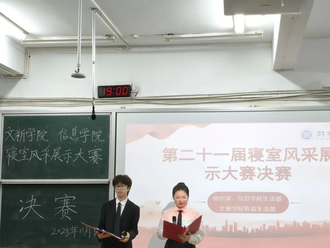 11月5日晚,文学与新闻传播学院和信息科学与工程学院在15117教室举办第二十一届寝室文化风采展示决赛。经过初赛的激烈角逐,共有20支寝室队伍进入决赛。