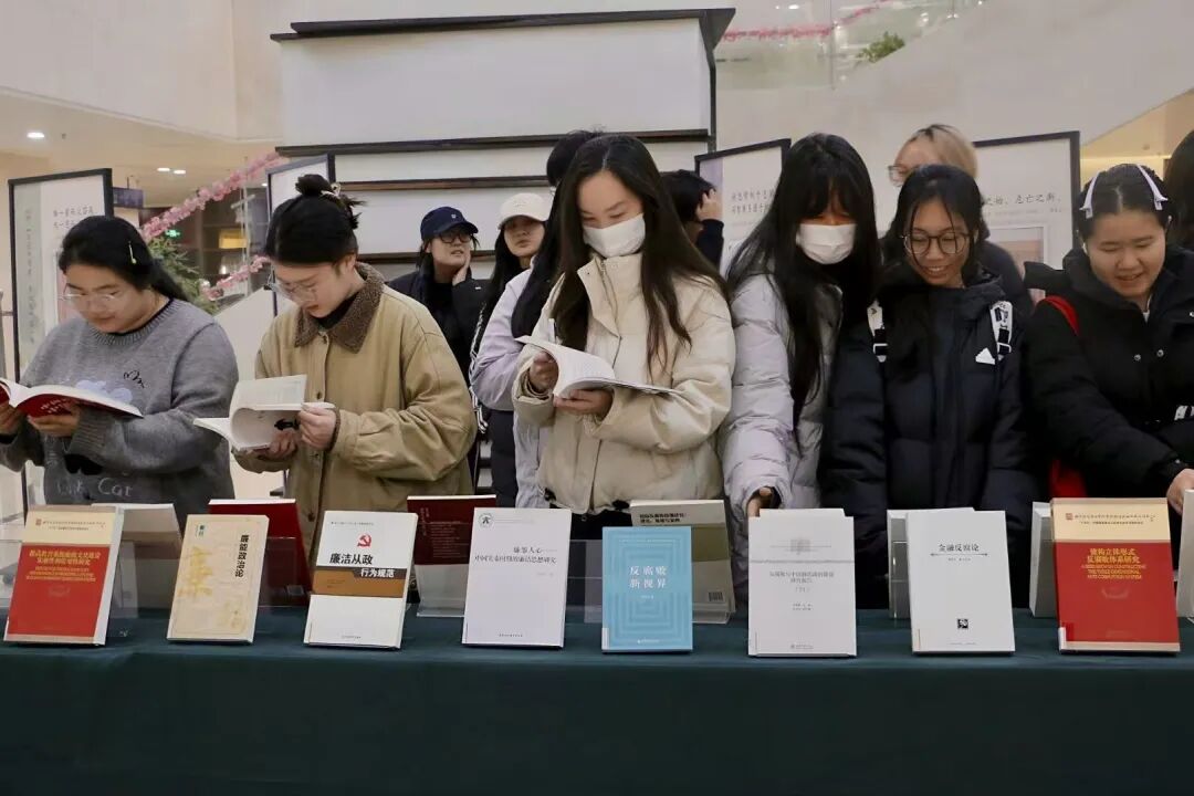 12月10日下午,院领导和支部书记们走进展览现场,在“经典铸廉”“书香润廉”“笔墨书廉”三大板块前驻足细看。其中,“经典铸廉”板块精选习近平总书记廉政建设论述中的古典用典,复刻《习近平用典——廉政篇》原著页面,将中华优秀传统文化与新时代廉政建设相结合;“书香润廉”板块突出展出党的建设理论研究、湖湘文化代表作品及监察监督理论研究三类图书,重点展现任弼时“骆驼精神”等湖湘廉洁基因;“笔墨书廉”板块则展示了12幅由学校离退休老同志创作的书法作品,其中谭先锋同志书写的“公生明,廉生威”,源自明代年富《官箴》刻石,深刻诠释了公正廉洁的为官之道。参观过程中,大家不时交流感悟,强调要以廉洁文化为引领,发挥示范带头作用,推动廉洁理念在校园落地生根。