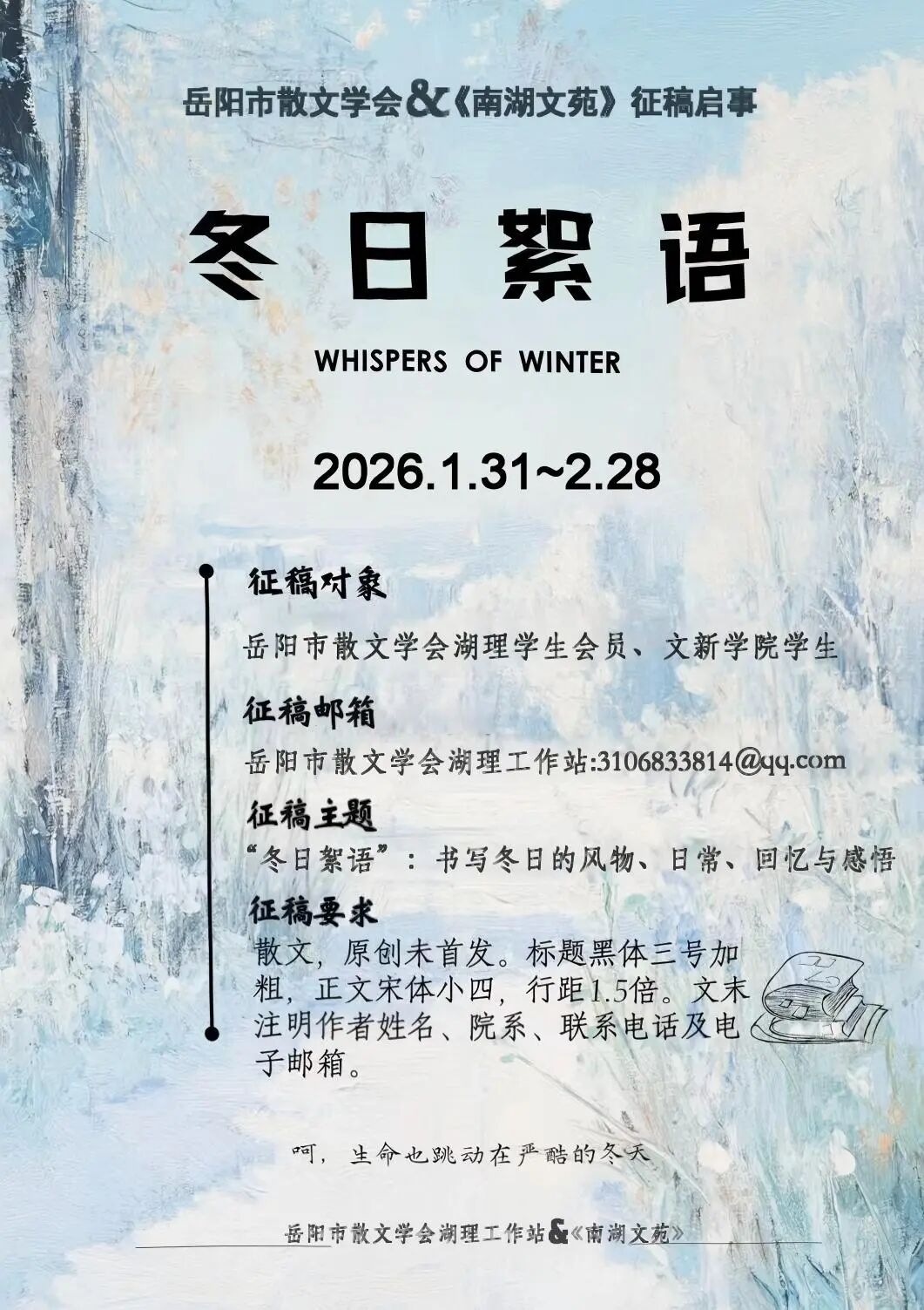 为激发创作灵感和热情,丰富学生创作成果,岳阳市散文学会与《南湖文苑》联合开展“冬日絮语”主题散文征稿活动。现将有关事项通知如下: